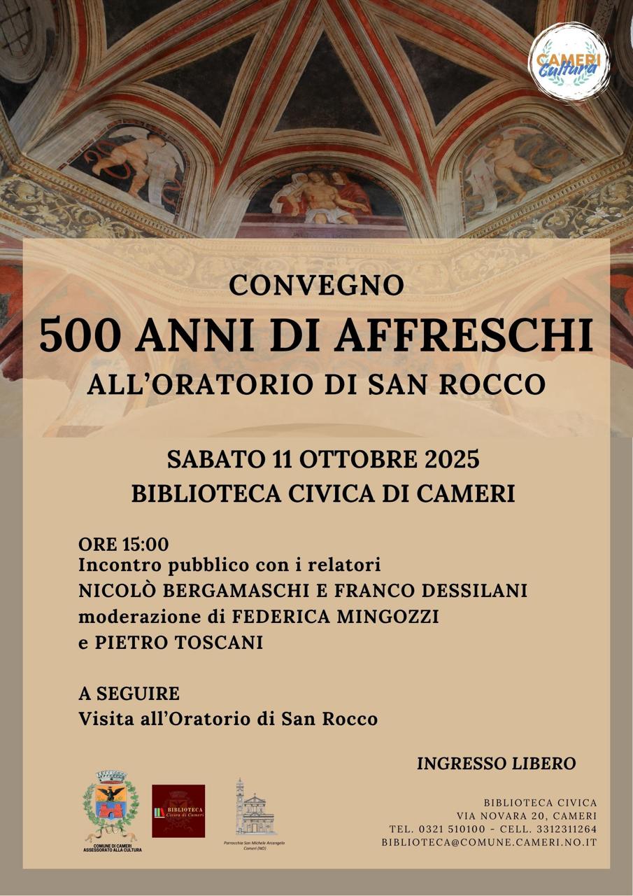 Il 3 giugno di 500 anni fa fu completato dal pittore novarese Giovanni Angelo Canta il ciclo di affreschi all’interno dell’oratorio di San Rocco di Cameri. Mezzo millennio dopo, il pregio artistico dell’oratorio è diventato fulcro del convegno “500 anni di affreschi all’Oratorio di San Rocco”.