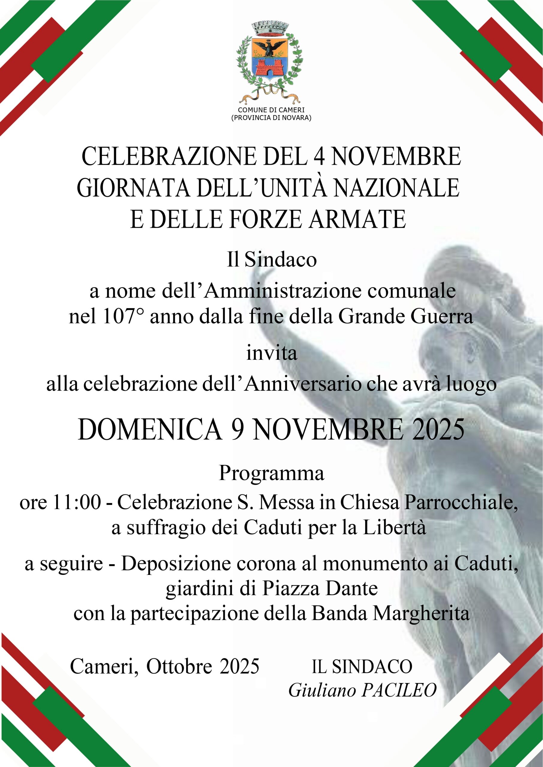Domenica 9 novembre si terrà la celebrazione della giornata dell’Unità nazionale e delle Forze Armate (associata da calendario al 4 novembre), nel 107° anno dalla fine della Grande Guerra.