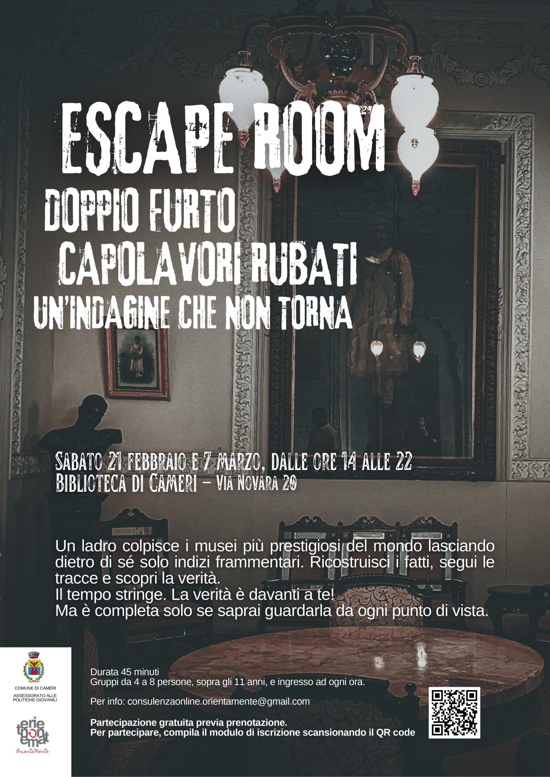 Sabato 21 febbraio e 7 marzo, presso la Biblioteca Civica di Cameri, è possibile partecipare tra le ore 14:00 e le ore 22:00 a una escape room incentrata sulla rapina in un museo.