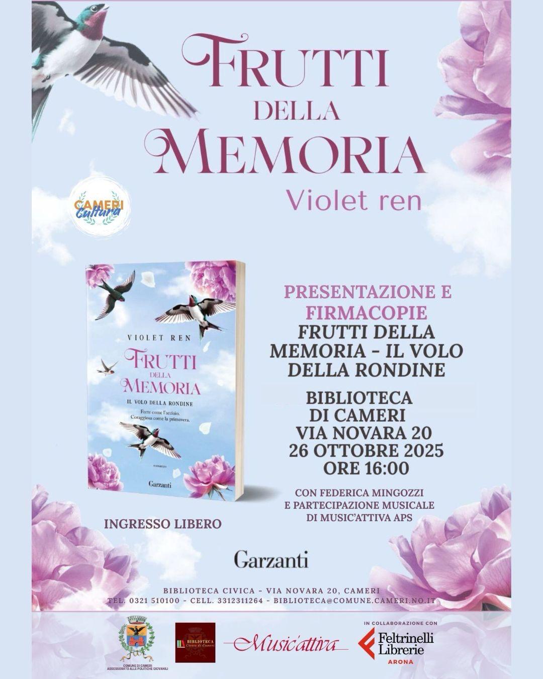 Domenica 26 ottobre 2025, Violet tornerà a Cameri con il secondo capitolo della storia d’amore tra Eirene e Alan: “Frutti della memoria: Il volo della rondine” (Garzanti, 2025) sarà presentato alle ore 16:00 in Biblioteca civica (via Novara 20) con la moderazione di Federica Mingozzi e l’accompagnamento musicale di Music’attiva APS. L’evento, a ingresso libero e con firmacopie, è organizzato dall’all’Assessorato alle Politiche Giovanili in collaborazione con la libreria Feltrinelli Point di Arona.