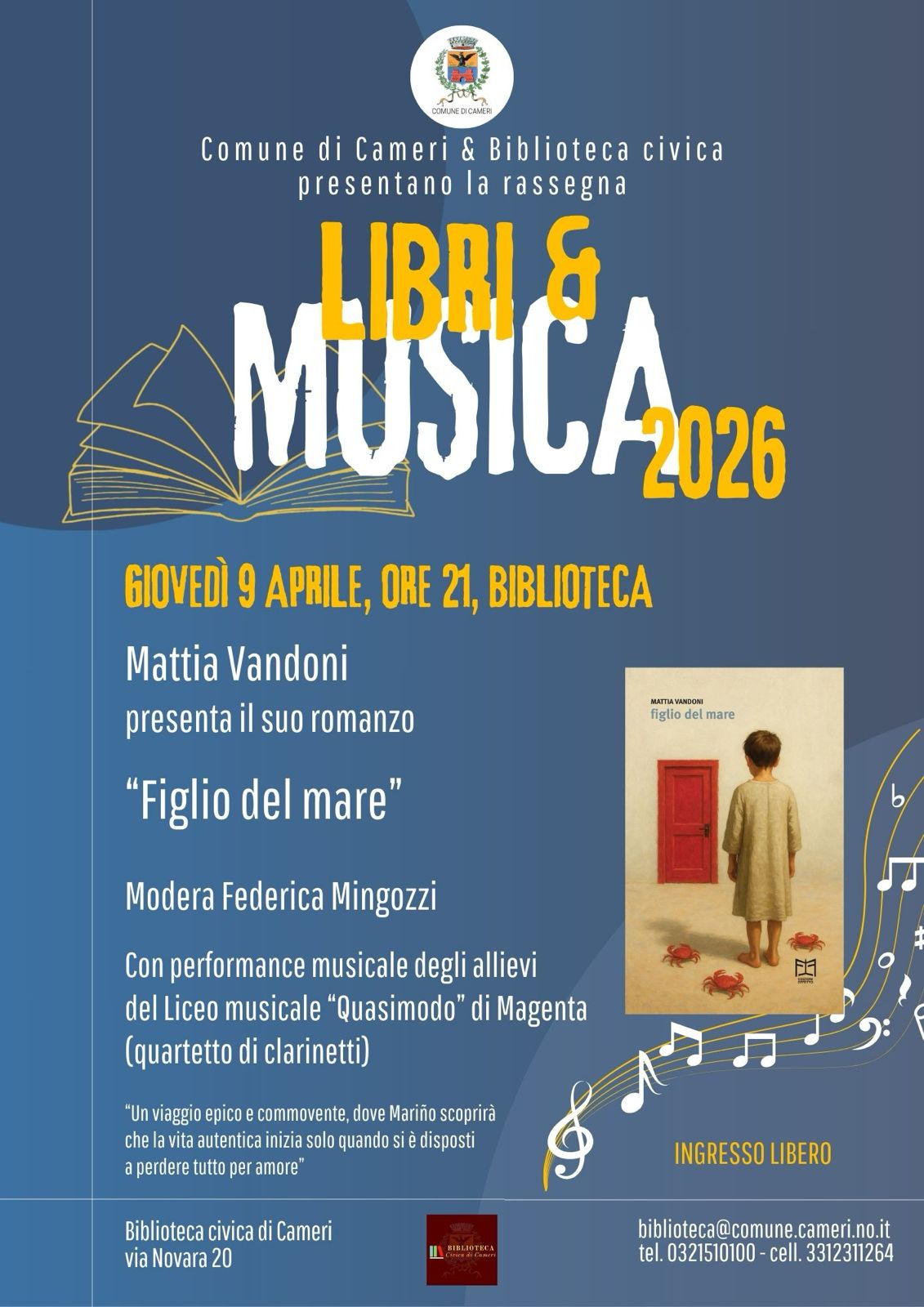 Una storia travolgente di sentimenti estremi, sacrifici, conflitti e redenzioni che racconta la forza dell’amore vero, quello capace di superare ogni barriera, persino l’odio, la guerra e il destino: giovedì 9 aprile a Cameri, alle ore 21 in Biblioteca civica (via Novara 20), Mattia Vandoni presenterà il suo romanzo “Figlio del mare” (Edizioni Effetto, 2025) accompagnato da Federica Mingozzi. L’appuntamento è parte della rassegna “Libri&Musica” e comprende la performance musicale degli allievi del Liceo musicale “Quasimodo” di Magenta, con un quartetto di clarinetti.