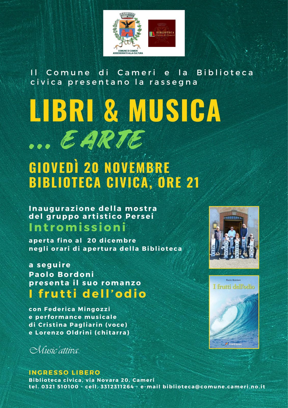Presso la Sala Mostre della Biblioteca Civica di Cameri, alle ore 21:00 di giovedì 20 novembre si terrò l’inaugurazione della mostra “Intromissioni” del gruppo artistico Persei, seguita dalla presentazione del romanzo “I frutti dell’odio”.