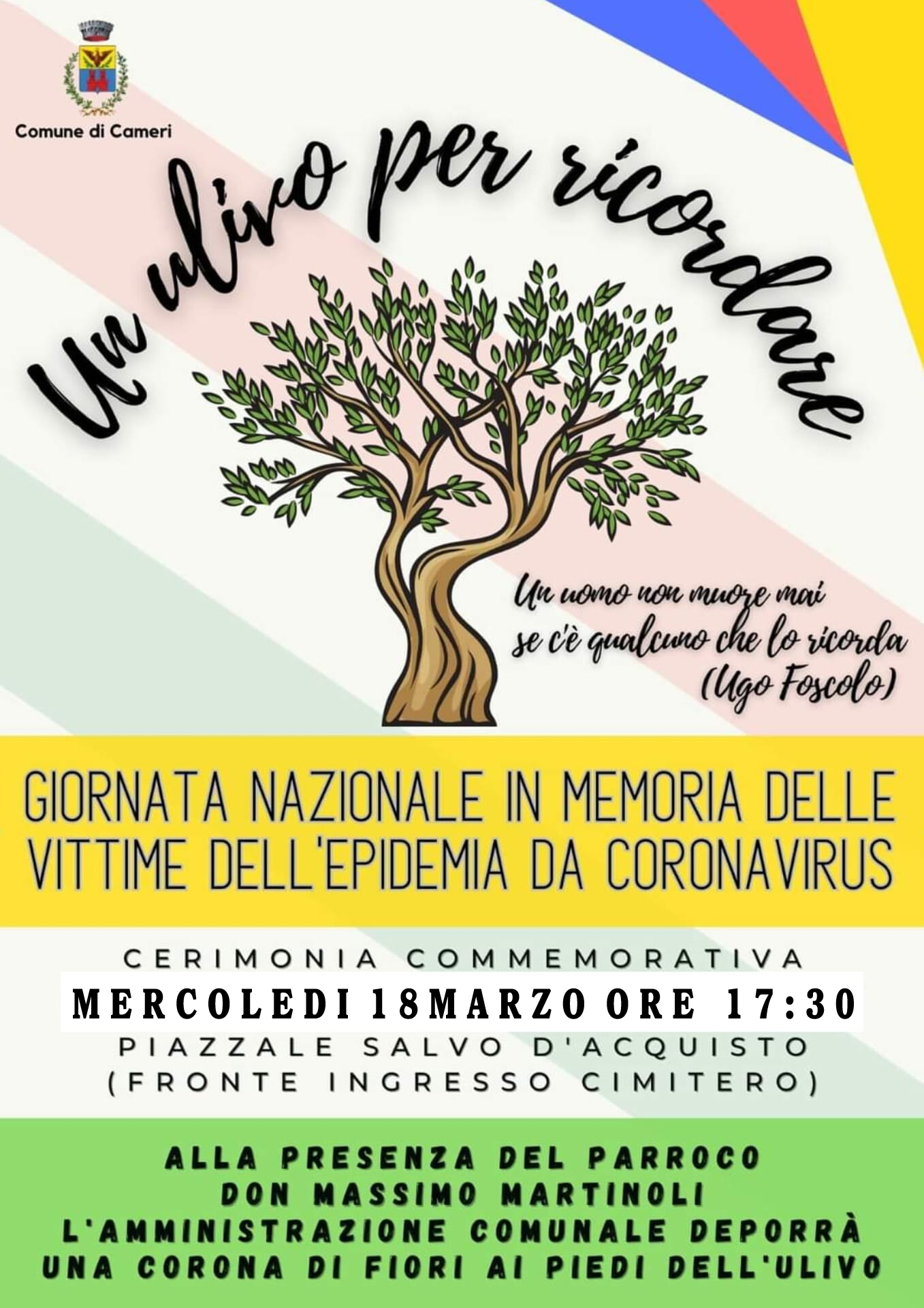 Mercoledì 18 marzo, alle ore 17:30 presso il Piazzale Saldo D’Acquisto (fronte ingresso del cimitero) si terrà una commemorazione in occasione della giornata nazionale in memoria delle vittime dell’epidemia da Coronavirus.